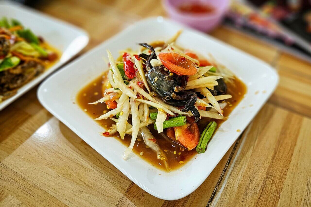 Papaya Salad with salted Crab in white plate on table. Som Tam, Thai green papaya salad with crabs. Thai Food, Isaan Food Dishes, Thai papaya salad.