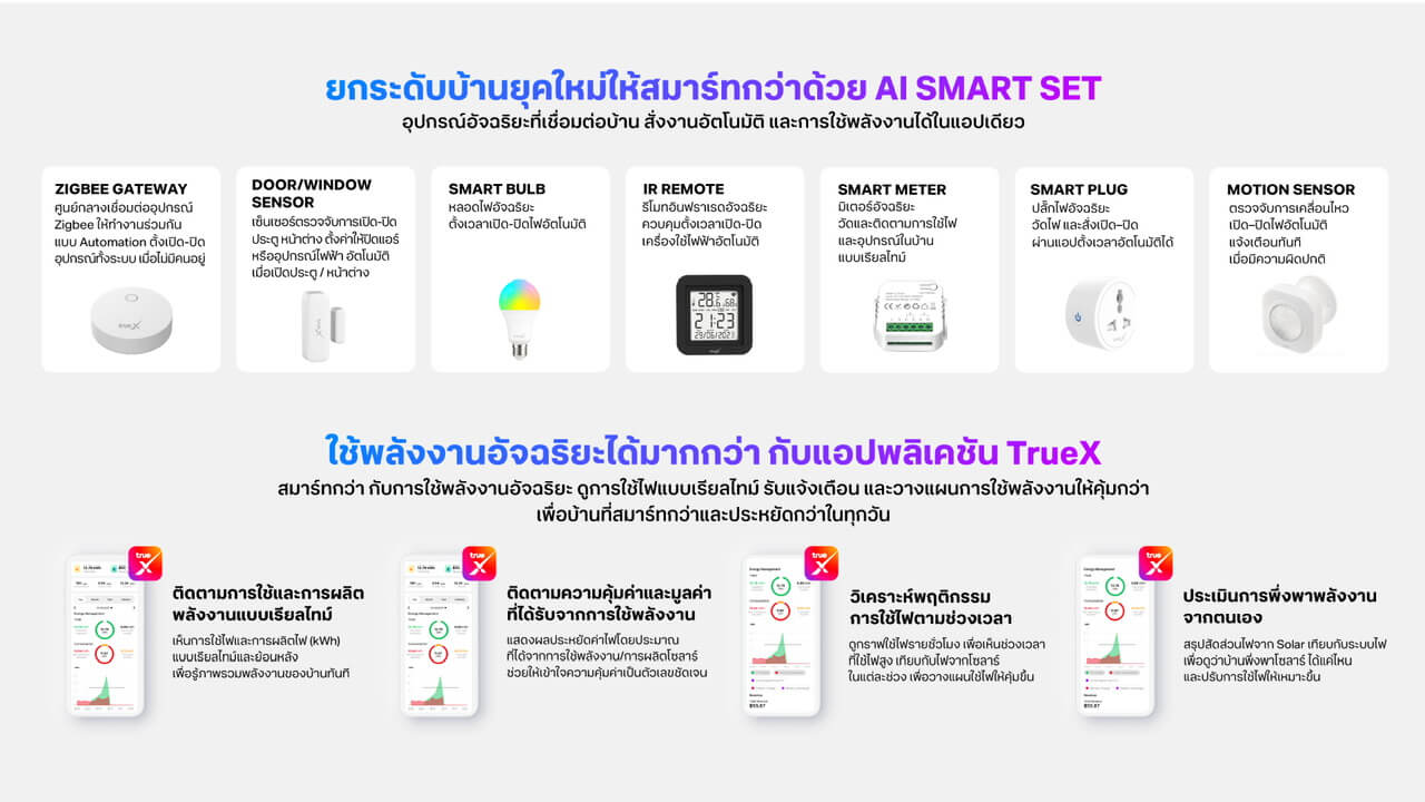 “Solar Smart Home เป็นอีกก้าวสำคัญของทรูออนไลน์ในการนำพลังงานสะอาดมาผสานกับเทคโนโลยีบ้านอัจฉริยะ เมื่อผสานความแข็งแกร่งของทรูออนไลน์ในฐานะเน็ตบ้านไฟเบอร์อันดับ 1 กับความเชี่ยวชาญด้านวิศวกรรมพลังงานของ Altervim จึงเกิดเป็นโซลูชัน One-stop Service ที่ดูแลลูกค้าอย่างครบวงจร ตั้งแต่การให้คำปรึกษา การสำรวจหน้างาน การดำเนินการด้านเอกสารของการไฟฟ้าฯ ไปจนถึงการติดตั้งตามมาตรฐานความปลอดภัยโดยทีมช่างทรูผู้เชี่ยวชาญ ที่ผ่านมาตรฐานการติดตั้งโซลาร์เซลล์อย่างมืออาชีพ พร้อมการรับประกันประสิทธิภาพการผลิตไฟฟ้ายาวนานถึง 30 ปี และทางเลือกผ่อนชำระสูงสุด 7 ปี เพื่อให้การเปลี่ยนผ่านสู่พลังงานสะอาดเป็นเรื่องที่เข้าถึงได้ง่ายสำหรับทุกครัวเรือน ยิ่งไปกว่านั้น นับเป็นเรื่องที่น่ายินดี ที่ทรูยังได้รับการคัดเลือกให้เป็น “Innovative Smart Energy Partner” จาก Huawei ร่วมกันพัฒนานวัตกรรมพลังงานอัจฉริยะ โดยนำเทคโนโลยี Huawei Fusion Solar มาผสานเข้ากับแพลตฟอร์ม TrueX เพื่อยกระดับประสบการณ์การบริหารจัดการพลังงานและสมาร์ทโฮมผ่านแอปพลิเคชันเดียว”
