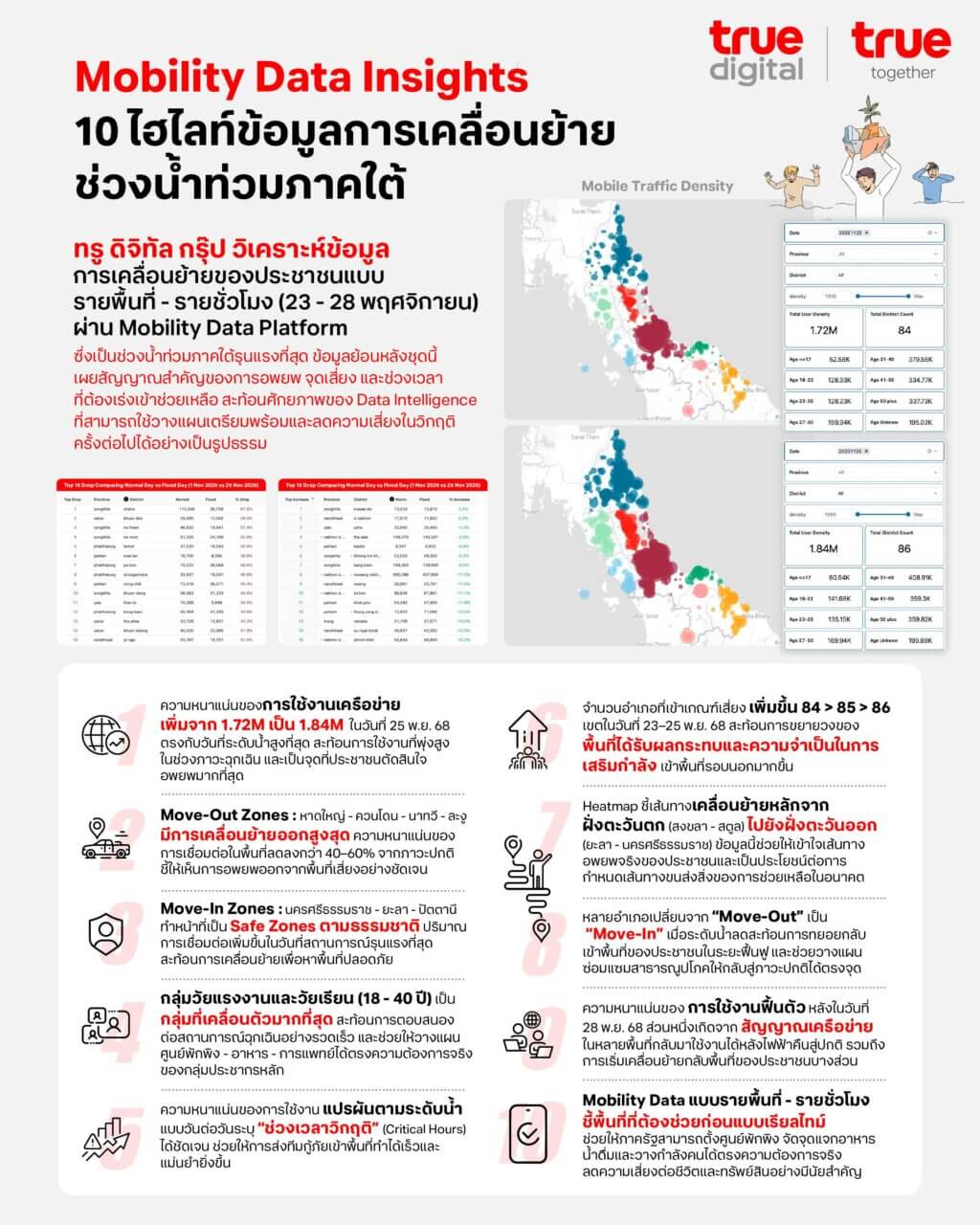 ทรู ดิจิทัล กรุ๊ป วิเคราะห์ข้อมูลการเคลื่อนย้ายของประชากรบนเครือข่ายทรู 5G ผ่าน Mobility Data Platform ตั้งแต่วันที่ 20 พฤศจิกายน 2568 และพบรูปแบบ “การอพยพผิดปกติ” ในหลายพื้นที่ เป็นสัญญาณเตือนระดับน้ำกำลังทวีความรุนแรง อาทิ การตรวจพบจำนวนประชากรในพื้นที่อำเภอจะนะ จังหวัดสงขลา ที่ลดลงสูงสุดถึง 68% รองลงมาคือ อำเภอควนโดน จังหวัดสตูล และอำเภอนาทวี จังหวัดสงขลา