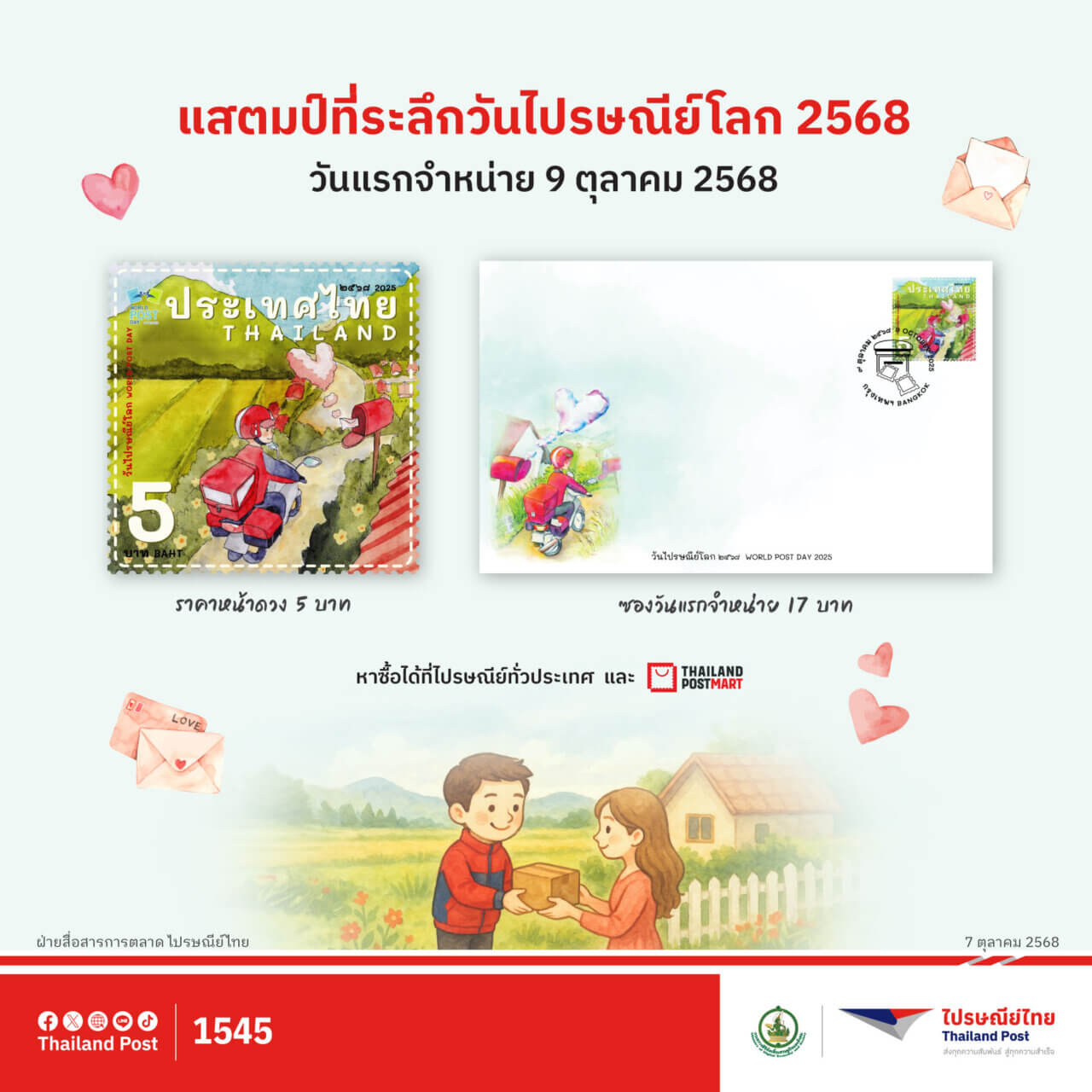 สนใจซื้อได้ที่พิพิธภัณฑ์แสตมป์ไทยสามเสนใน (BTS สะพานควาย) รวมถึงที่ทำการไปรษณีย์ในกรุงเทพฯ และทุกจังหวัด เริ่มจำหน่ายวันแรก 9 ต.ค. 68 นี้ ซึ่งตรงกับวันไปรษณีย์โลก (World Post Day)